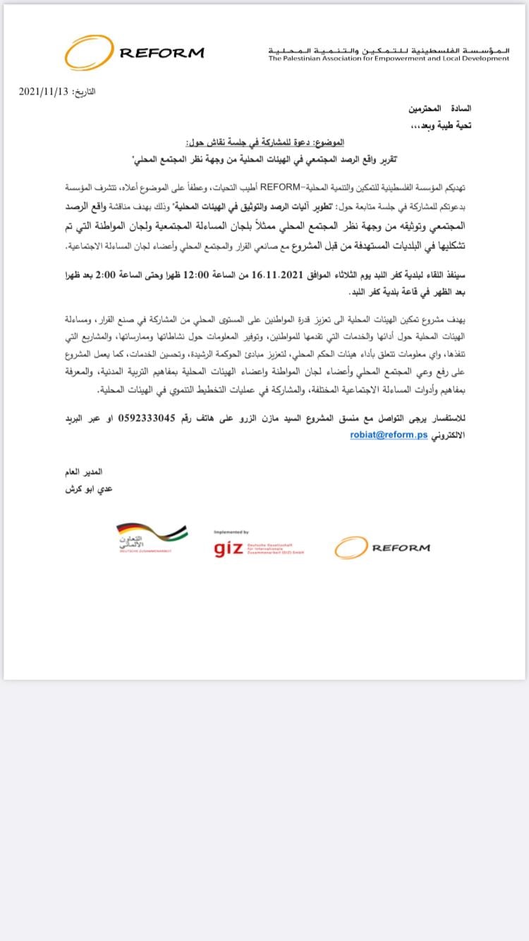 كفر اللبد: جلسة نقاش حول الرصد المجتمعي بالهيئات المحلية