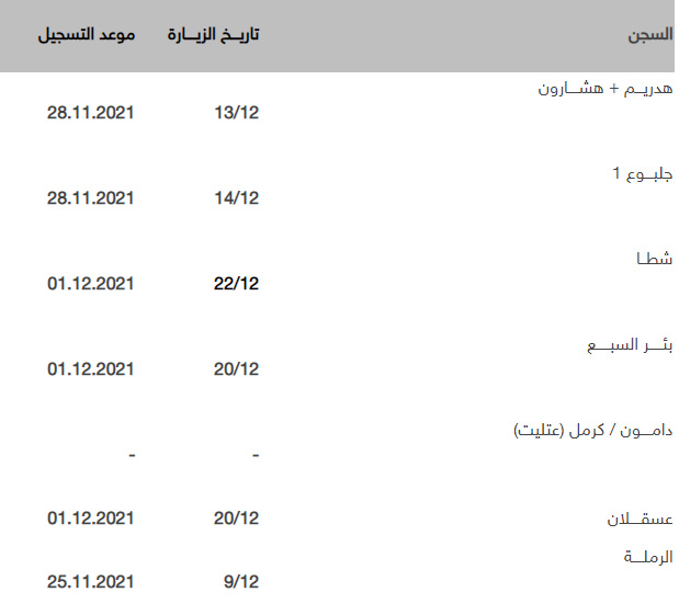وأوضحت اللجنة أن التسجيل للزيارات ينتهي قبل موعد الزيارة بأسبوع ولن يتم التسجيل بعد الموعد المذكور، ومسموح التسجيل لثلاثة زوار لكل أسير.