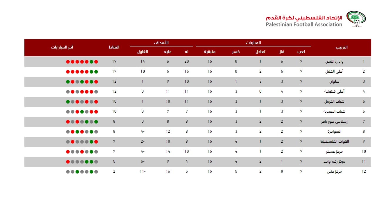 ومع ختام مباريات الأسبوع السابع، يتصدر "ترجي واد النيص" سلم الترتيب بـ19 نقطة، يليه "أهلي الخليل" بـ17 نقطة، ثم "سلوان" في المركز الثالث بـ12 نقطة، وبفارق الأهداف عن "أهلي قلقيلية" الذي يحتل المركز الرابع.