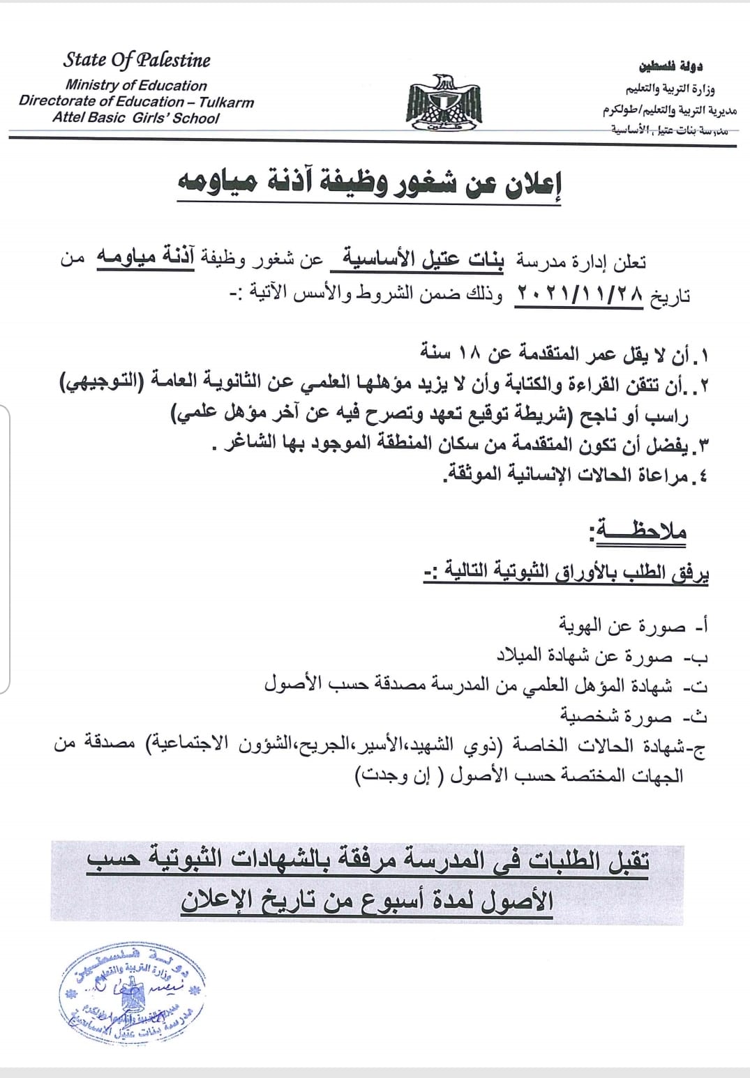 مدرسة بنات عتيل الأساسية: مطلوب آذنة