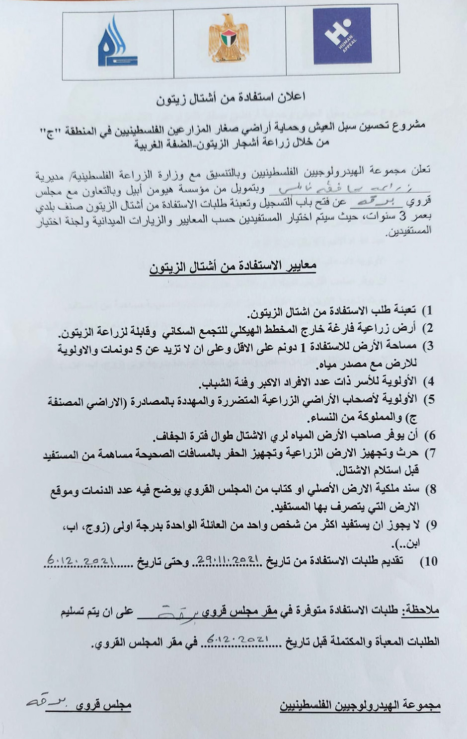 أعلن مجلس قروي برقة، الاثنين 29.11.2021، عن توفر أشتال زيتون بالتعاون مع مجموعة الهيدرولوجيين بالتنسيق مع وزارة الزراعة وبتمويل من مؤسسة هيومن أبيل. حسب شروط ومعايير موضحة بالإعلان.