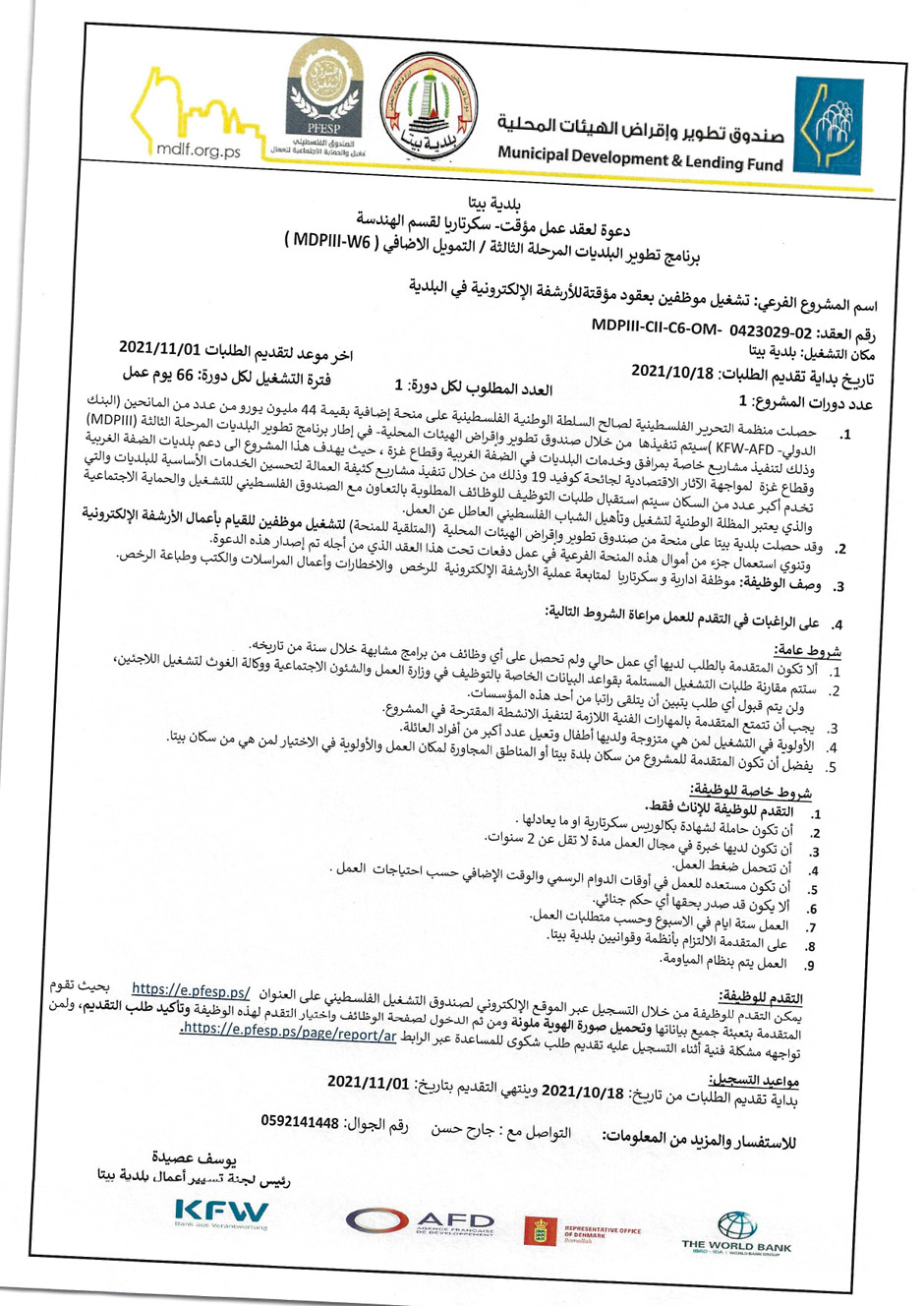أعلنت بلدية بيتا، الثلاثاء 30.11.2021، عن حاجتها لموظفة إدارية للعمل في بلدية بيتا ولفترة محدودة ضمن نظام المياومة، وذلك ضمن برنامج التشغيل الممول من صندوق تطوير وإقراض الهيئات المحلية، ضمن التفاصيل في الإعلان أدناه، أو الرابط المرفق.