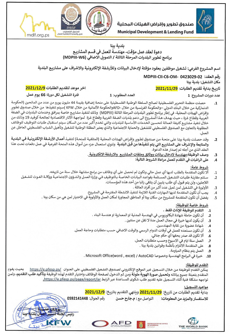 أعلنت بلدية بيتا، الثلاثاء 30.11.2021، عن حاجتها لمهندسة للعمل في قسم المشاريع بعقد مؤقت وبنظام المياومة، وذلك ضمن برنامج التشغيل الممول من صندوق تطوير واقراض الهيئات المحلية، للتفاصيل في الاعلان المرفق أو الرابط أدناه.