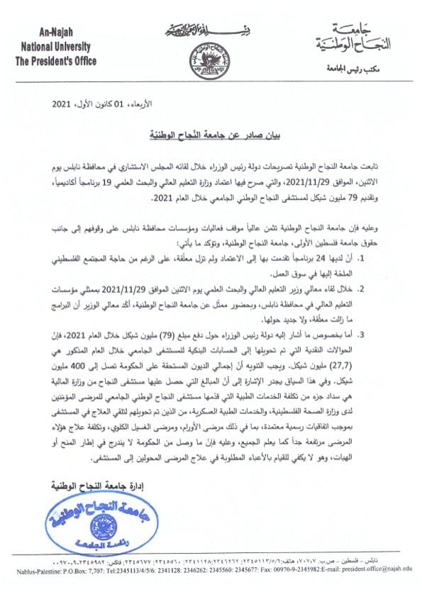 نشرت جامعة النجاح، الأربعاء 01.12.2021، بياناً حول ما تحدث عنه رئيس الوزراء بخصوص الحوالات التي تم تحويلها إلى جامعة النجاح، ويقول البيان بأنها ليست هبات بل هي جزء من المستحقات التي لمستشفى النجاح على الحكومة.