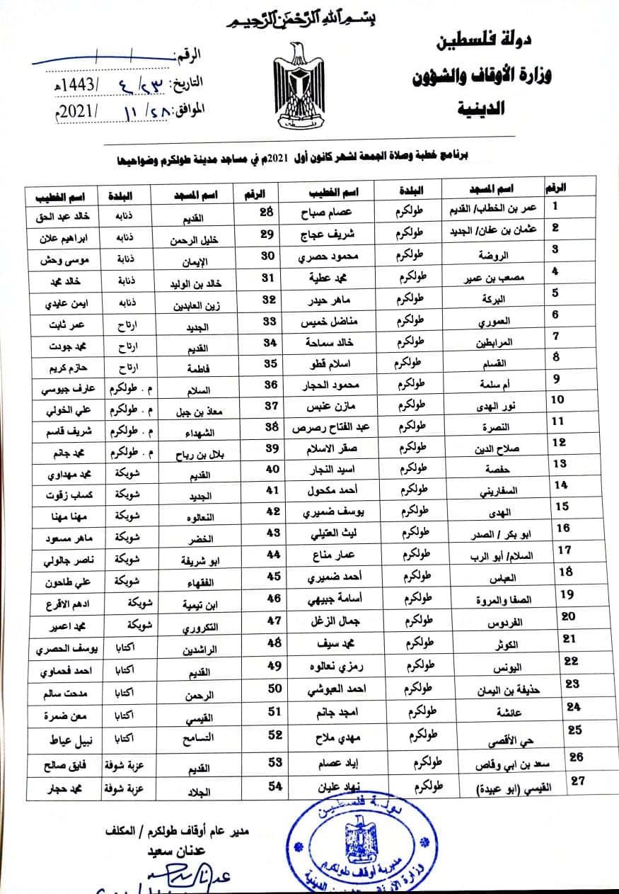 خطباء صلاة الجمعة في طولكرم وضواحيها لشهر كانون أول 2021.