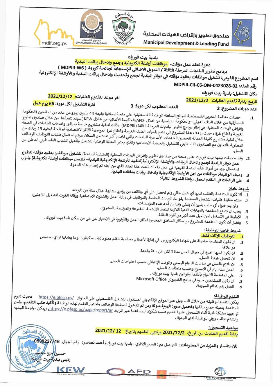 تعلن بلدية بيت فوريك عن حاجتها موظفات أرشفة إلكترونية بعقد مؤقت، عدد 3، للعمل في مشروع تأهيل وصيانة طرق داخلية وبناء جدران استنادية في بيت فوريك.