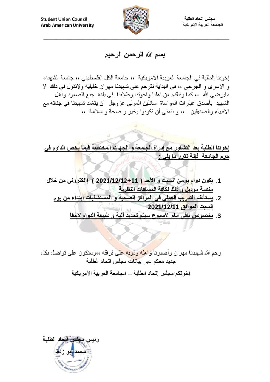 مجلس اتحاد الطلبة في الجامعة العربية الأمريكية يعلن عن آلية الدوام في الجامعة والتدريب العملي.