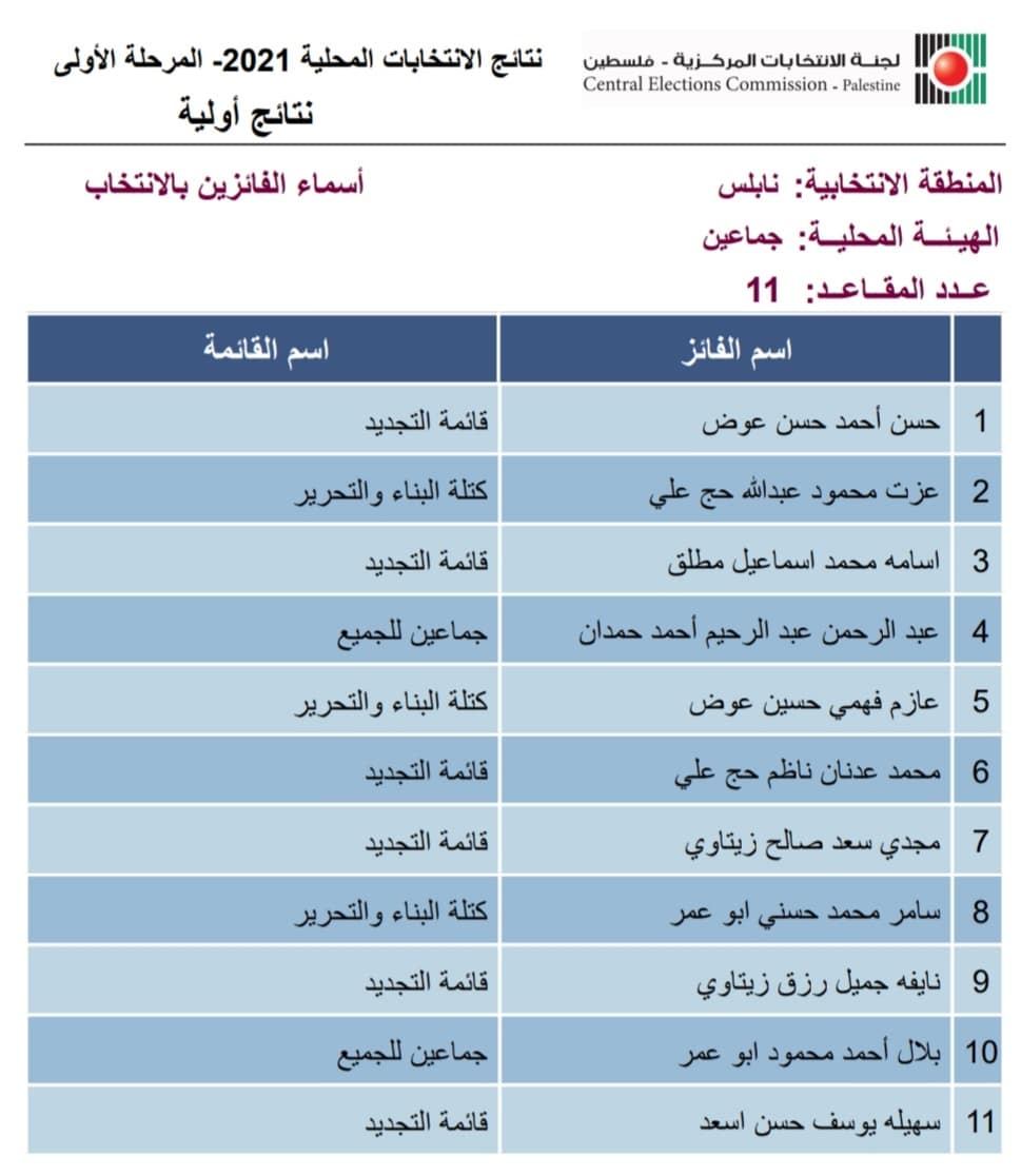 لجنة الانتخابات المركزية تعلن نتائج الانتخابات المحلية - المرحلة الأولى في جماعين، الأحد 12.12.2021.