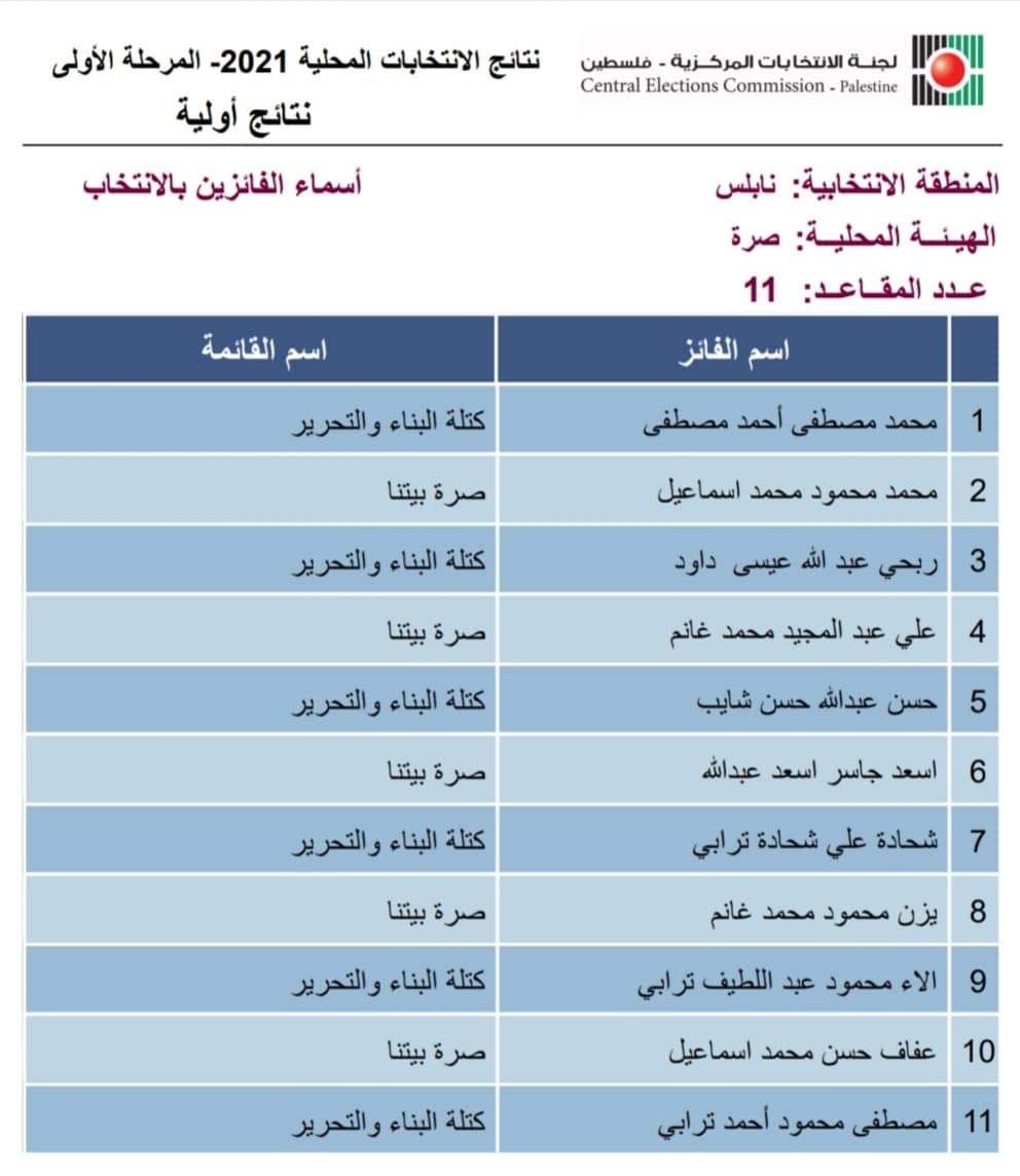 لجنة الانتخابات المركزية تعلن نتائج الانتخابات المحلية - المرحلة الأولى في صرة، الأحد 12.12.2021.