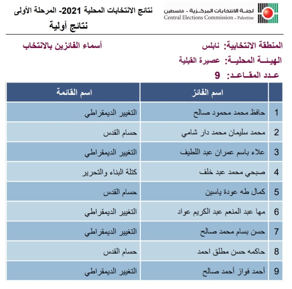 عصيرة الشمالية: نتائج الانتخابات المحلية الرسمية