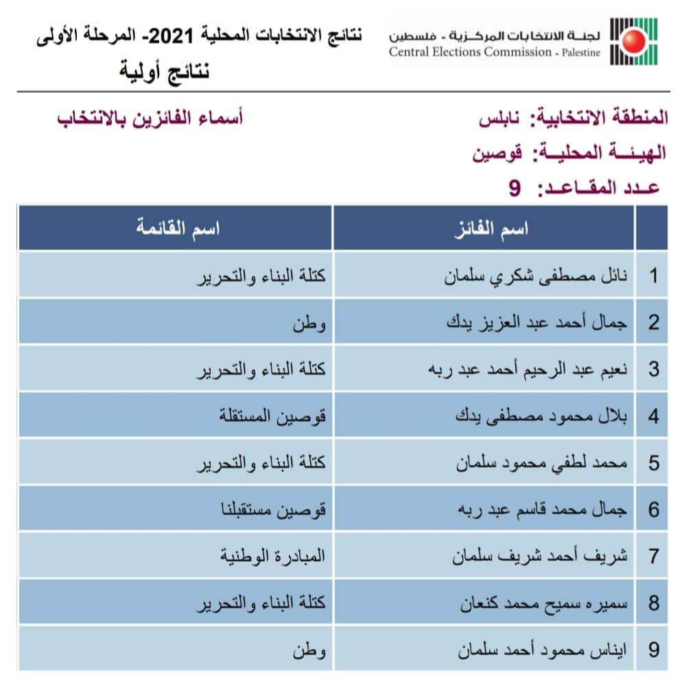 سبسطية: نتائج الانتخابات المحلية الرسمية
