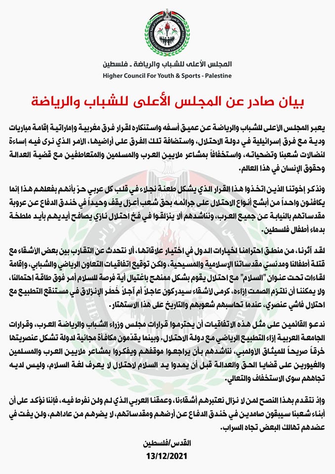 بيان صادر عن المجلس الأعلى للشباب والرياضة يستنكر قرار فرق مغربية وإماراتية إقامة مباريات ودية مع فرق إسرائيلية في إسرائيل، واستضافة تلك الفرق على لديها.