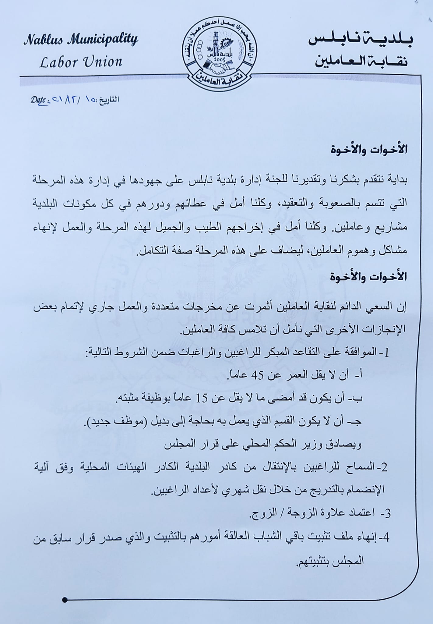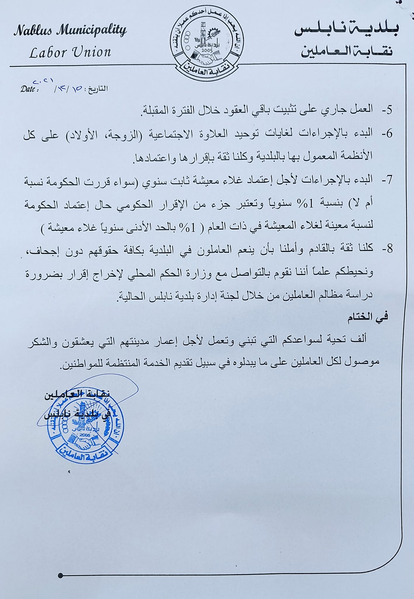مطالب نقابة العاملين في بلدية نابلس