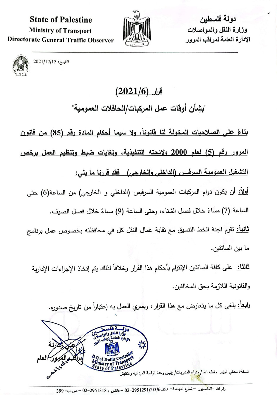 وزارة النقل والمواصلات تحدد أوقات دوام المركبات العمومية.