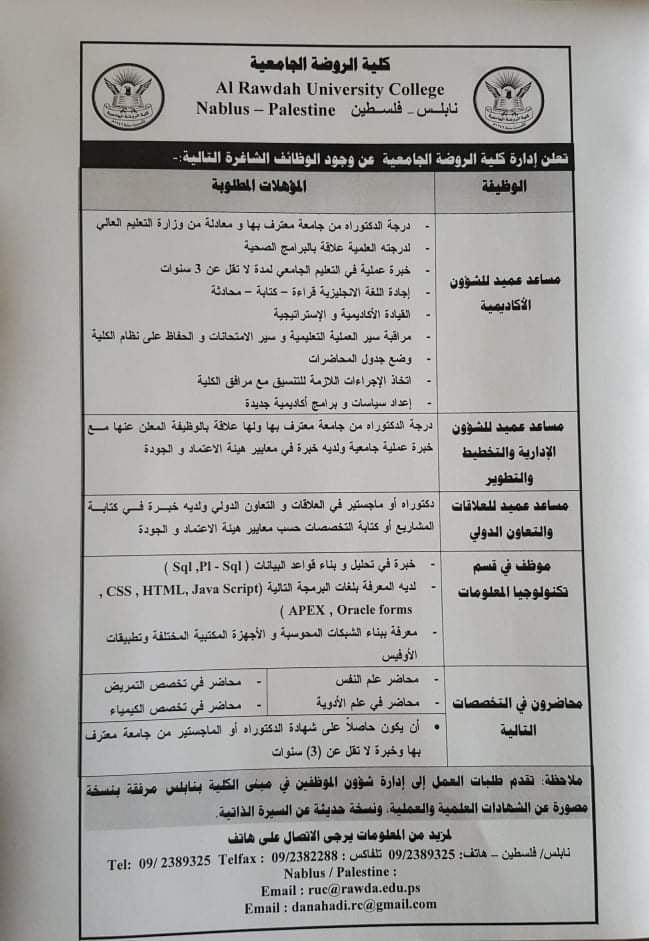 نابلس: وظائف شاغرة في كلية الروضة