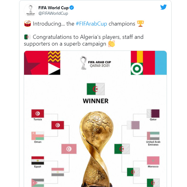 لأول مرة في تاريخه يحرز المنتخب الجزائري لقب كأس العرب، بعد فوز مثير على تونس بهدفين مقابل لا شيء، تم تسجيلهما في الوقت الإضافي، عقب انتهاء وقت المباراة الأصلي دون أهداف.