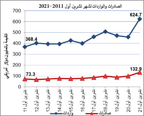 أما الميزان التجاري والذي يمثل الفرق بين الصادرات والواردات، فقد سجل ارتفاعاً في قيمة العجز بنسبة 23% خلال شهر تشرين أول من عام 2021 مقارنة مع الشهر السابق، كما ارتفع بنسبة 37% مقارنة مع شهر تشرين أول من عام 2020، حيث بلغت قيمة العجز 491.8 مليون دولار أمريكي.