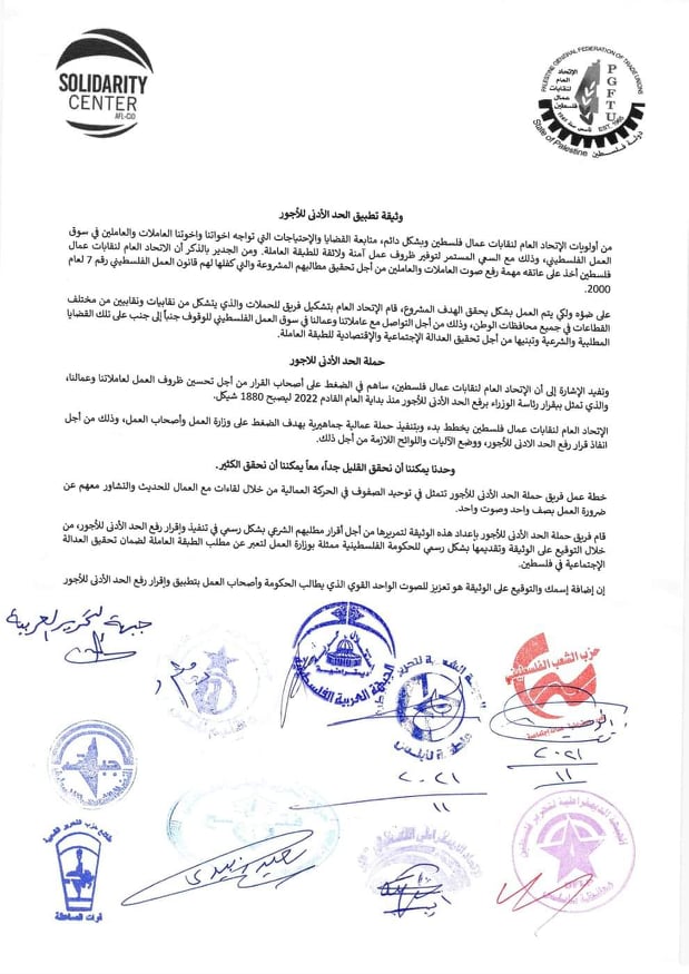 وأكدت اللجنة على دعمها والتزامها بقرار رفع الحد الأدنى للأجور من 1450 شيكلا إلى 1880 شيكل الأمر الذي يتناسب مع الأوضاع الاقتصادية والغلاء المعيشي الذي يعاني منه شريحة العمال الفلسطينيين.