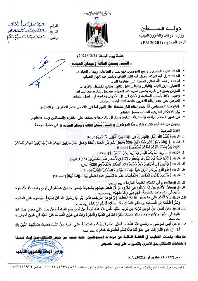 وزارة الأوقاف والشؤون الدينية تعلن عن موضوع خطبة الجمعة، 24.12.2021.