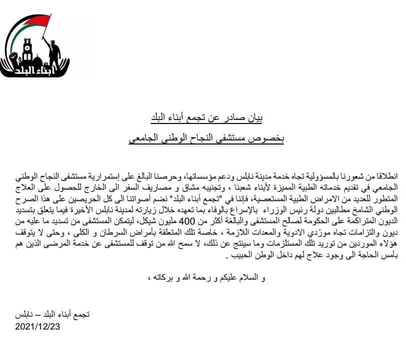 بيان صادر عن تجمع أبناء البلد في نابلس بخصوص أزمة مستشفى النجاح الجامعي.