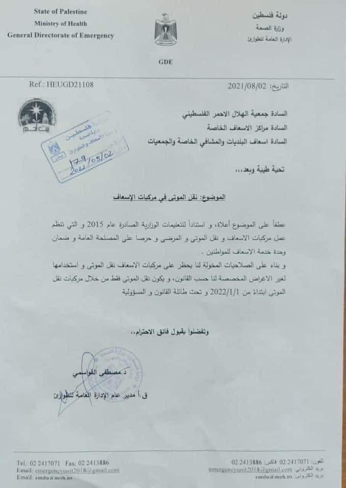وزارة الصحة تعلن عن حظر نقل الموتى في مركبات الإسعاف بدءاً من تاريخ 01.01.2022.