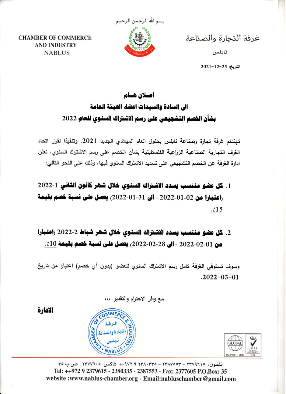 نشرت غرفة تجارة وصناعة نابلس، الأحد 26.12.2021، إعلانا هاما بخصوص الخصم التشجيعي على رسوم الاشتراك السنوي للعام 2022.