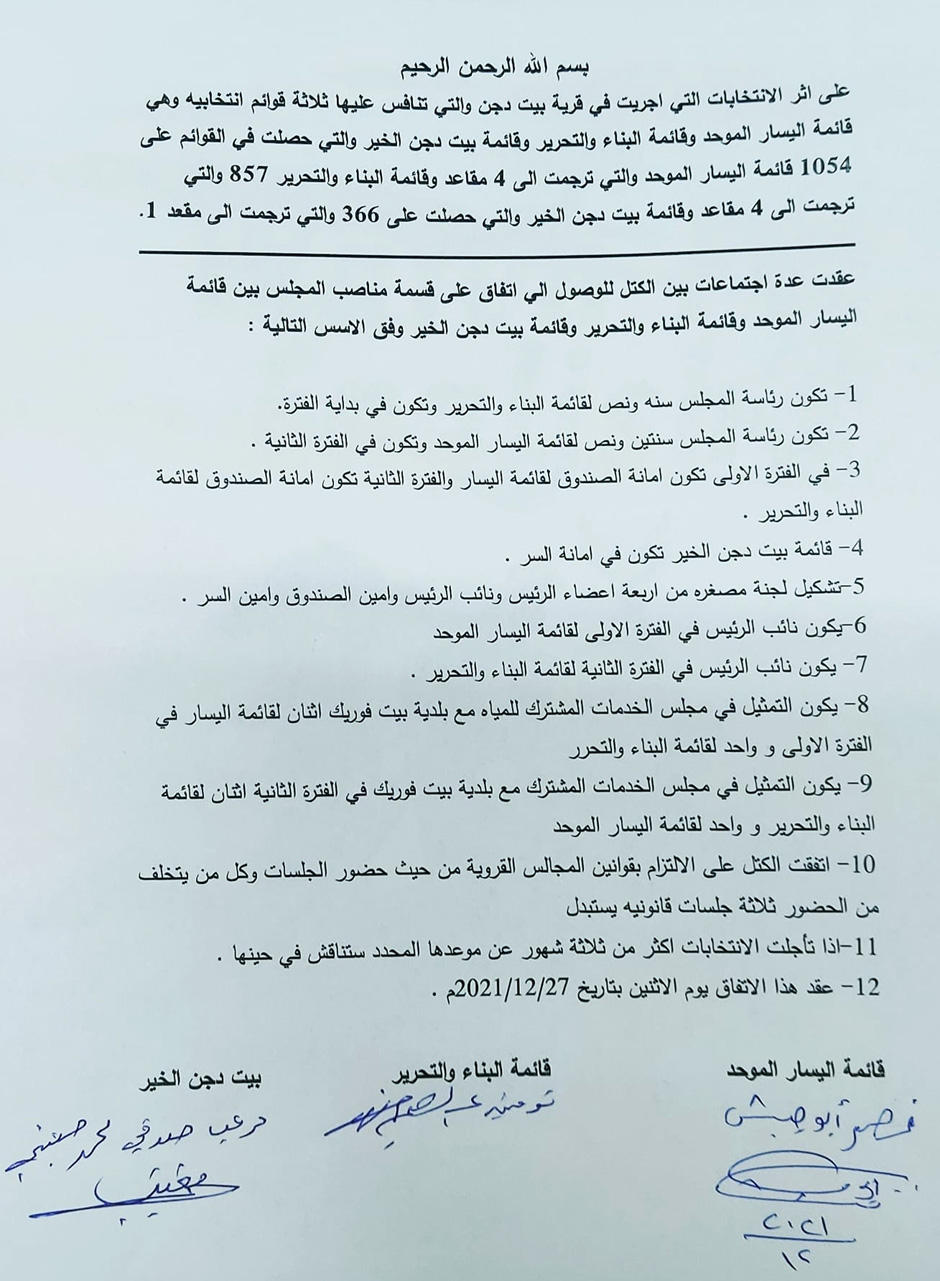 مجلس قروي بيت دجن ينشر نص الاتفاق مابين الكتل الثلاث الفائزة بالانتخابات المحلية على تقاسم الفترة المقبلة لمجلس قروي بيت دجن.