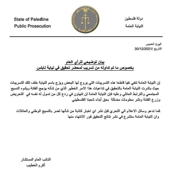 تحذر النيابة العامة من خطورة تداول أية وثائق أو بيانات تتعلق بقضية التخابر مع العدو والتي تم تداولها مؤخراً والمنظورة أمام القضاء، لتداعياته السلبية على السلم الاهلي والنظام العام، وتؤكد النيابة العامة أنه تم إحالة الملف إلى المحكمة المختصة، حيث تجري وقائع المحاكمة بشكل علني وفقاً لما ضمنه القانون الأساسي الفلسطيني.