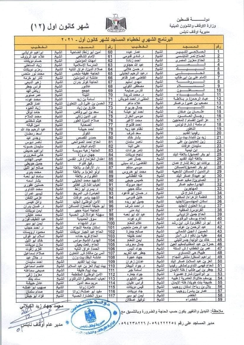 خطباء الجمعة في نابلس وضواحيها ليوم الجمعة 31.12.2021.
