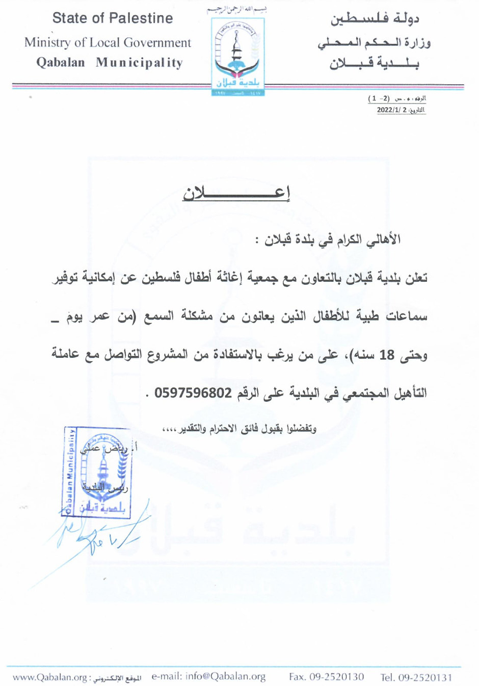 بلدية قبلان بالتعاون مع جمعية إغاثة أطفال فلسطين عن توفر سماعات طبية للأطفال الذين يعانون من مشاكل في السمع من عمر يوم إلى 18 سنة.