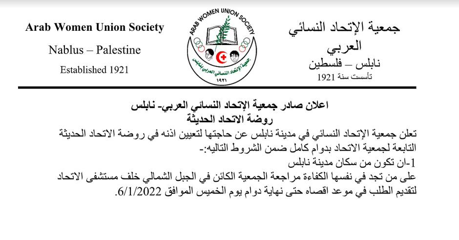 جمعية الاتحاد النسائية تعلن عن حاجتها لتعيين آذنة في روضة الاتحاد الحديثة بنابلس.