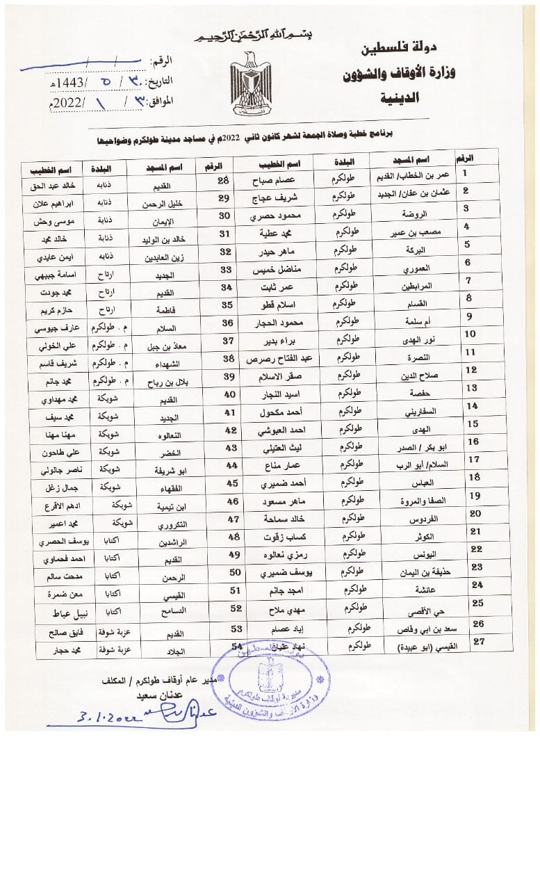 برنامج توزيع خطباء الجمعة لشهر كانون ثاني 2022 لمدينة طولكرم والضواحي.