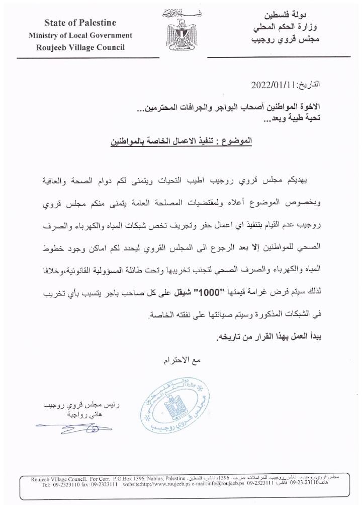 مجلس قروي روجيب يعمم على أصحاب البواجر والجرافات بعدم تنفيذ أعمال حفر وتجريف تخص شبكات المياه والكهرباء والصرف الصحي دون الرجوع إلى المجلس.