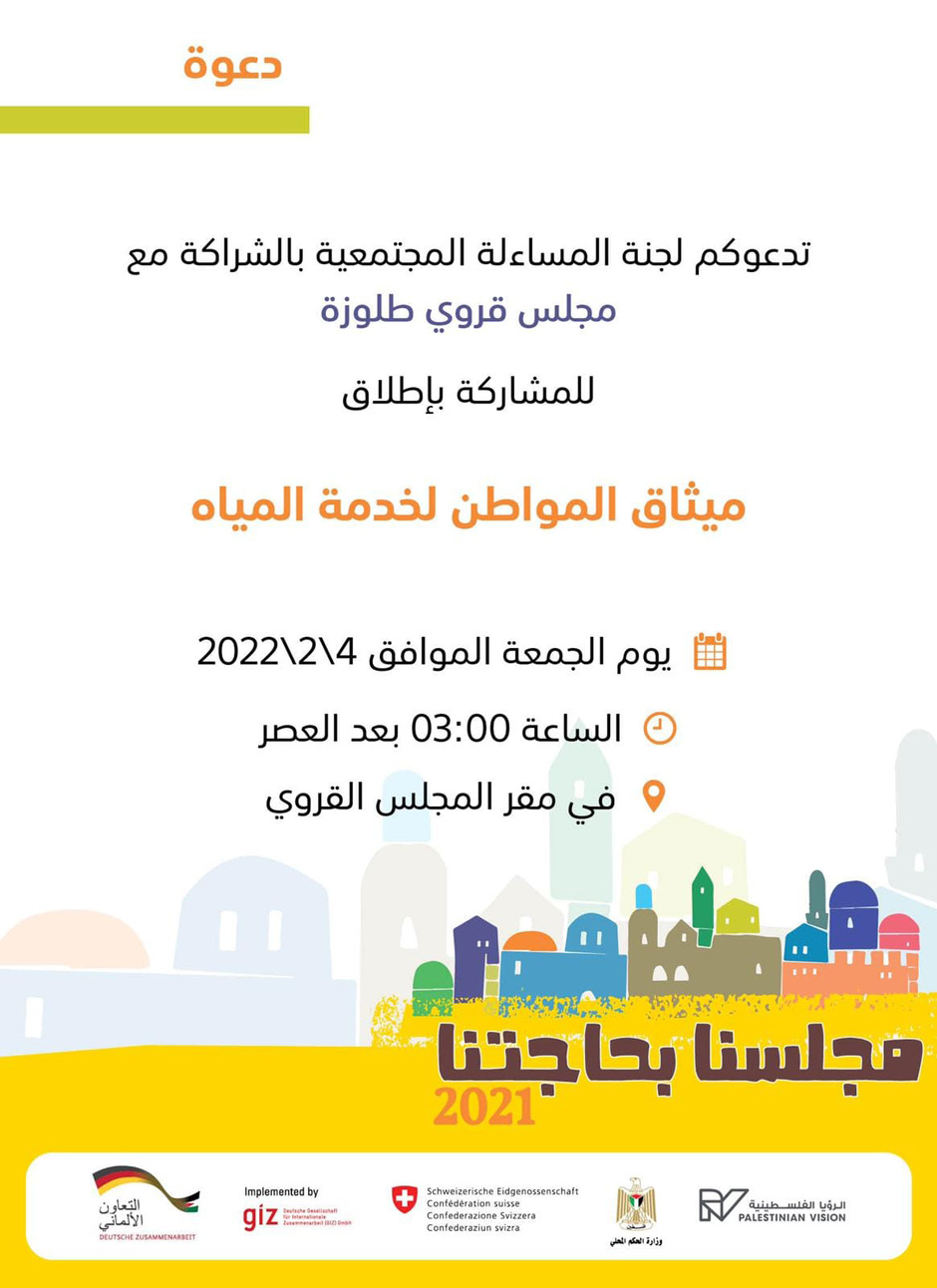 نشر مجلس قروي طلوزة، السبت 29.01.2022، دعوة من لجنة المساءلة المجتمعية بالشراكة مع مجلس قروي طلوزة إلى المواطنين للمشاركة بإطلاق ميثاق المواطن لخدمة المياه.