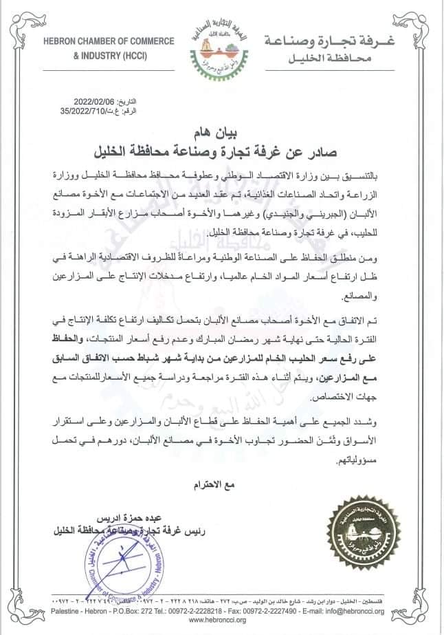 أعلنت غرفة تجارة وصناعة الخليل، الأحد 06.02.2022،عن أنه تم الاتفاق مع مصانع الألبان (الجبريني والجنيدي) وغيرهما، على عدم رفع أسعار منتجاتها حتى نهاية شهر رمضان.