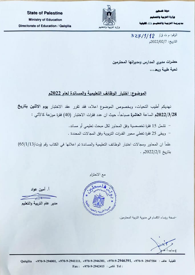 تربية قلقيلية: تحديد موعد اختبار التوظيف