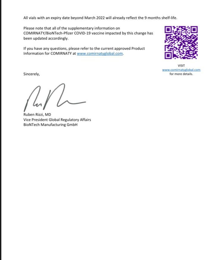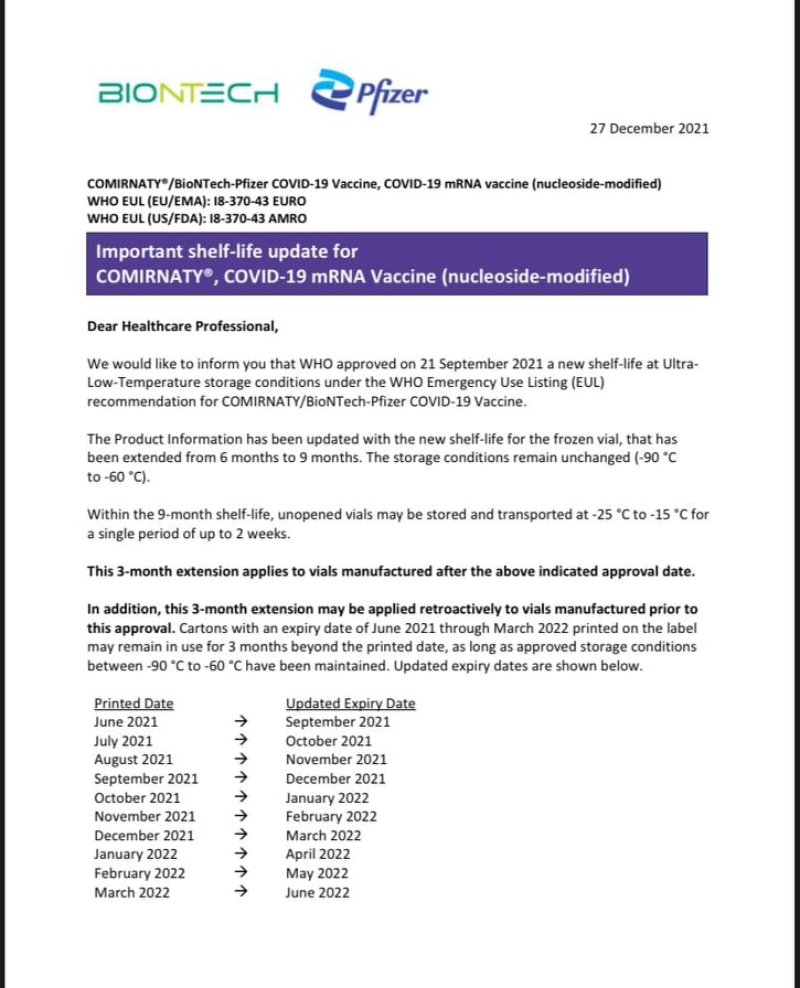 "بخصوص ما يُتداول حول وجود لقاحات منتهية الصلاحية، هذه مراسلة شركة فايزر لجميع وزارات الصحة تتضمن تمديد صلاحية اللقاحات حسب ما هو موضح لثلاثة أشهر. لا وجود لأي لقاحات منتهية الصلاحية.