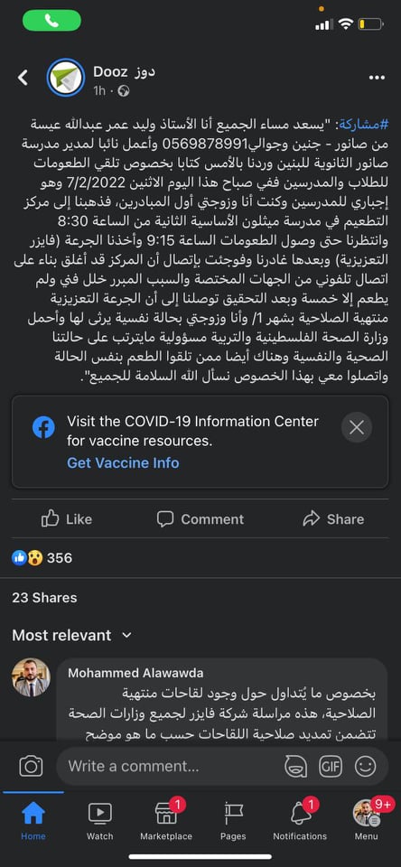 نشر مدير دائرة الإعلام بوزارة الصحة محمد عواودة، الاثنين 07.02.2022، تعليقاً بخصوص مناشدة نشرت على صفحة دوز بخصوص لقاح فايزر، وفيما يلي المناشدة وتعليق مدير دائرة الإعلام: