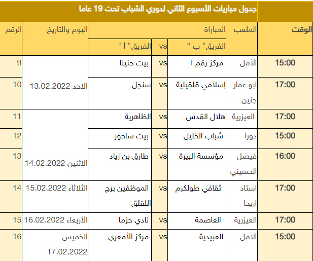 أعلن الاتحاد الفلسطيني لكرة القدم، الخميس 10.02.2022، جدول مباريات الأسبوع الثاني لدوري الشباب تحت 19 عاما.