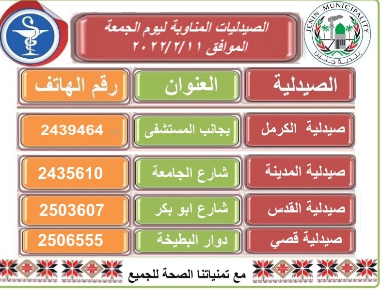 أرقام هواتف وأسماء الصيدليات المناوبة في مدينة جنين وضواحيها ليوم الجمعة 11.02.2022.