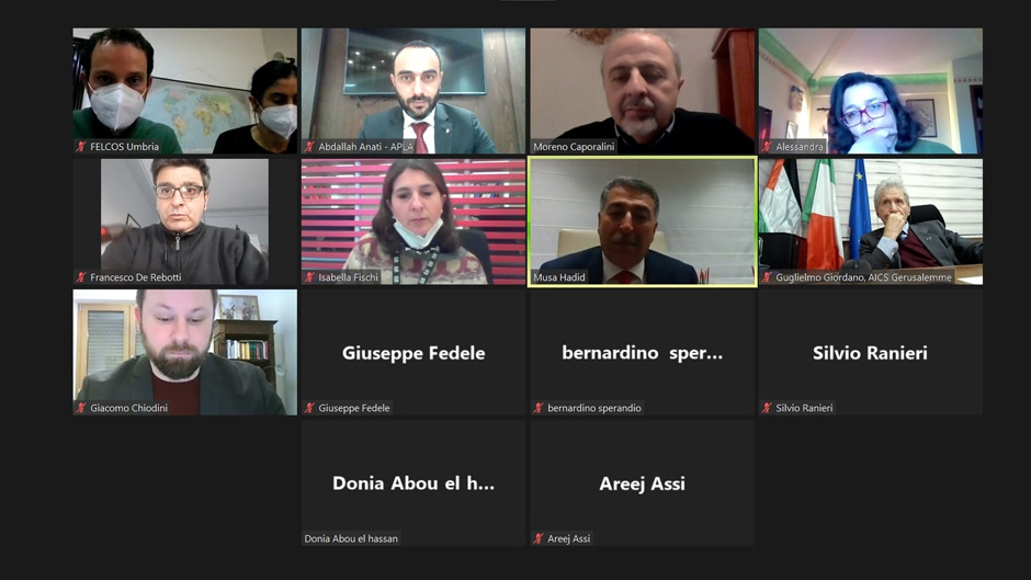 عقد اتحاد الهيئات المحلية بالتعاون مع منظمة FELCOS UMBRIA الإيطالية الاجتماع الأول لمشروع "شبكة الهيئات المحلية للتنمية المستدامة L.A.N.D" افتراضيًا عبر تقنية "زووم"، جاء ذلك بمشاركة وحضور رئيس الاتحاد موسى حديد، والقصنل العام لإيطاليا في القدس جوزيبي فيديل، ورئيسة بلدية بيت لقيا أريج عاصي والمدير التنفيذي للاتحاد عبد الله عناتي، ومدير الوكالة الإيطالية للتعاون الإنمائي في فلسطين غولييملو جيودانو، ورئيس اتحاد بلديات ترازيمينو جياكومو تشيوديني، وممثلين عن هيئات محلية إيطالية.