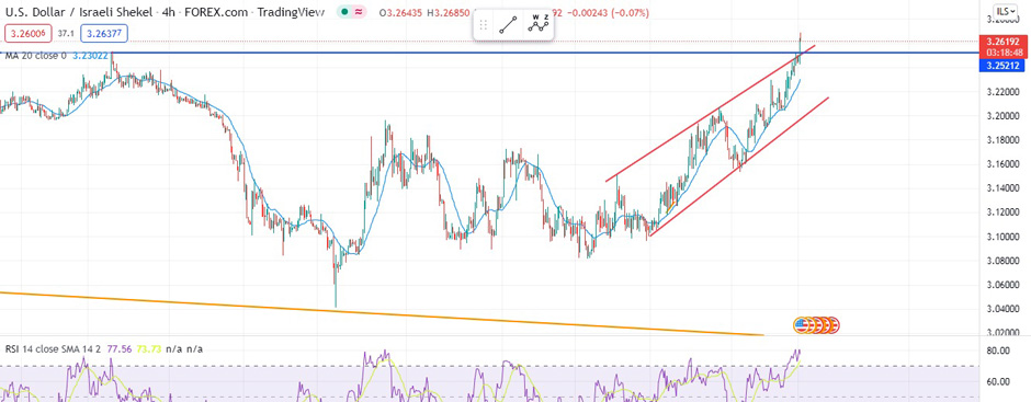 ويظهر الرسم البياني لزوج العملات دولار شيكل إيجابية حتى الآن مخترقا الحد العلوي من القناة التي يسير بها في نطاق 3.25-3.20 شيكل.
