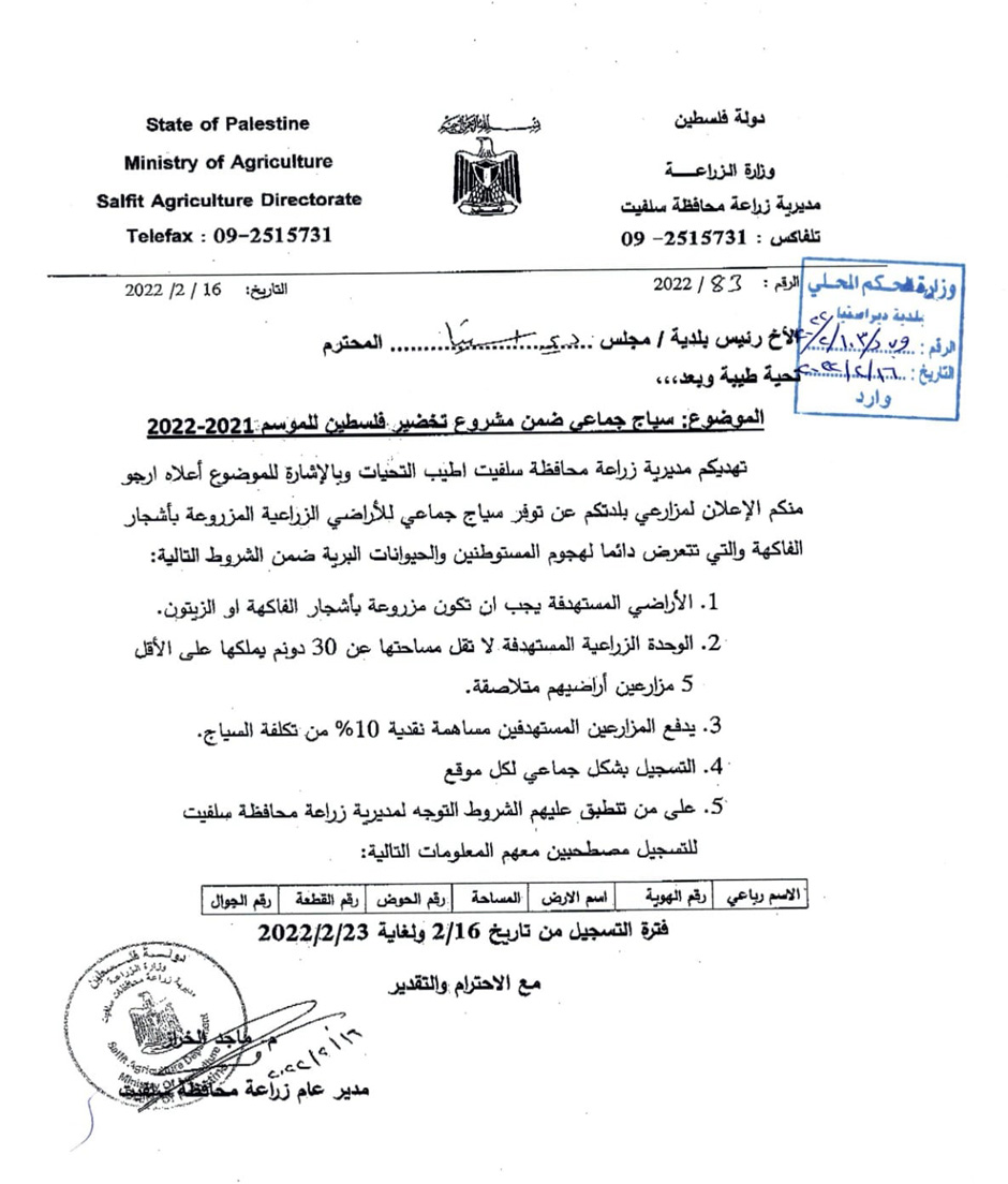 نشرت بلدية دير إستيا، الأربعاء 16.02.2022، إعلانا من مديرية زراعة سلفيت حول توفر سياج جماعي ضمن مشروع تخضير فلسطين للموسم 2021 - 2022.