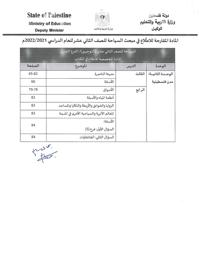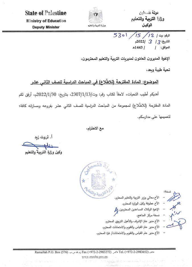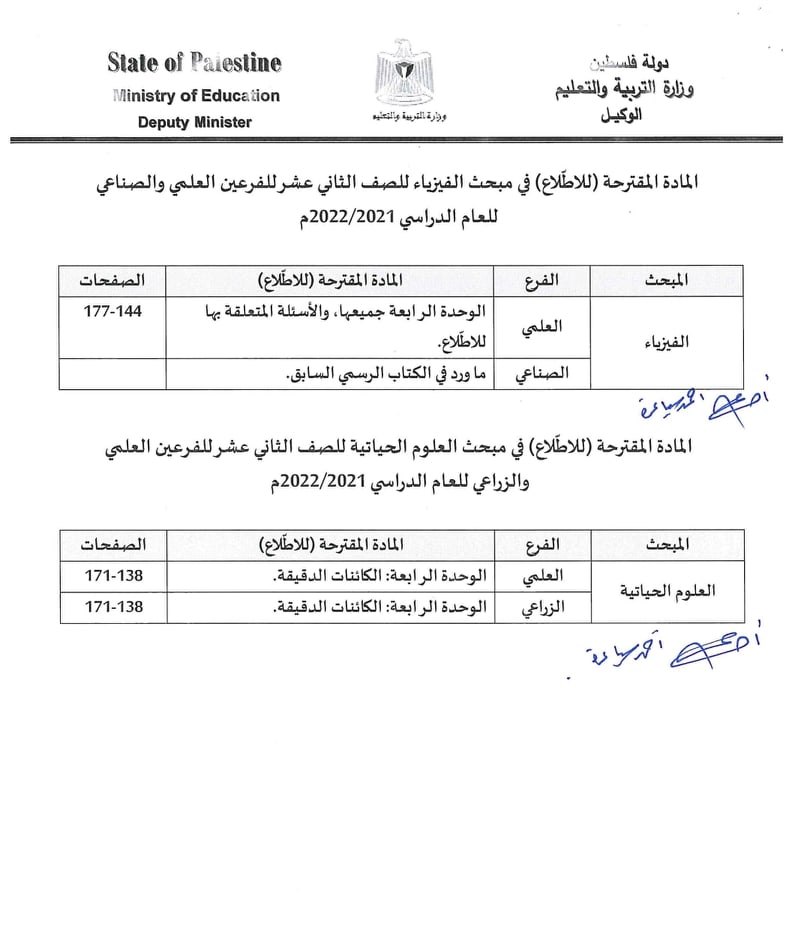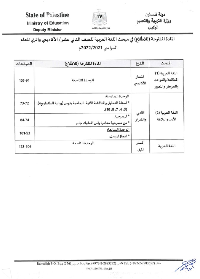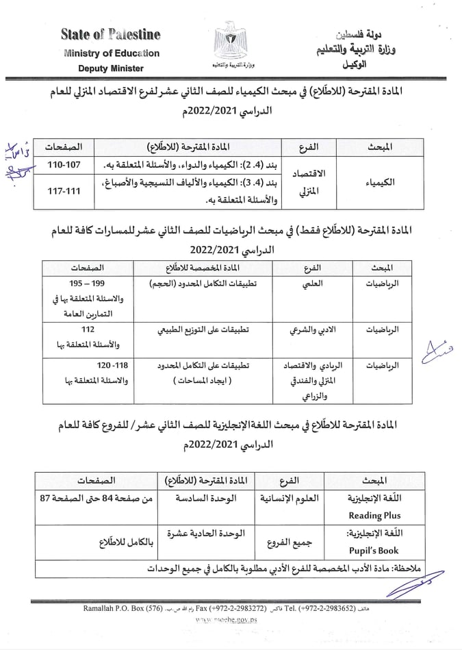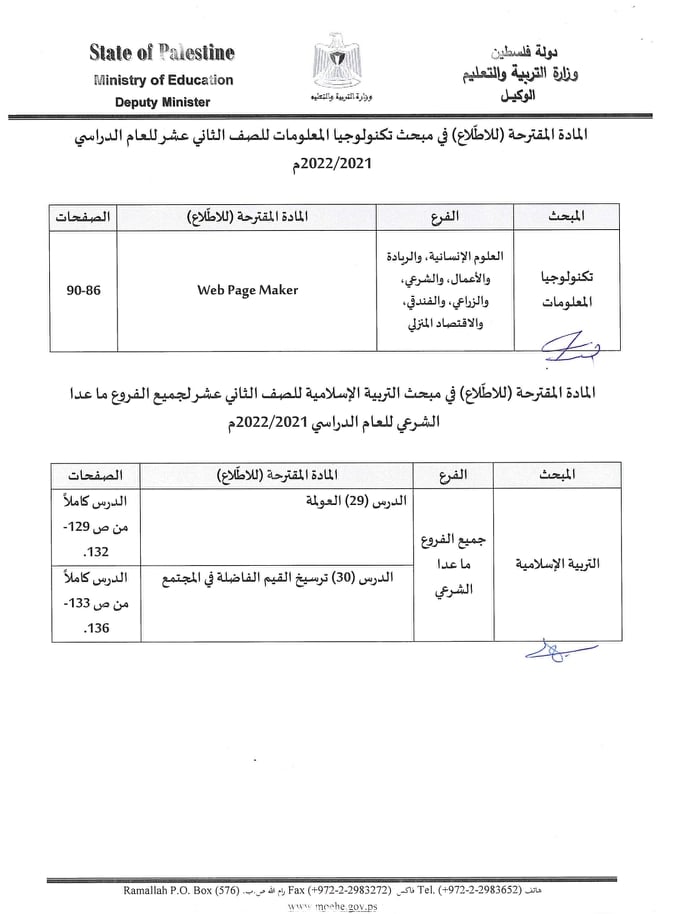 المادة المقترحة (للاطلاع) في المباحث الدراسية للتوجيهي.