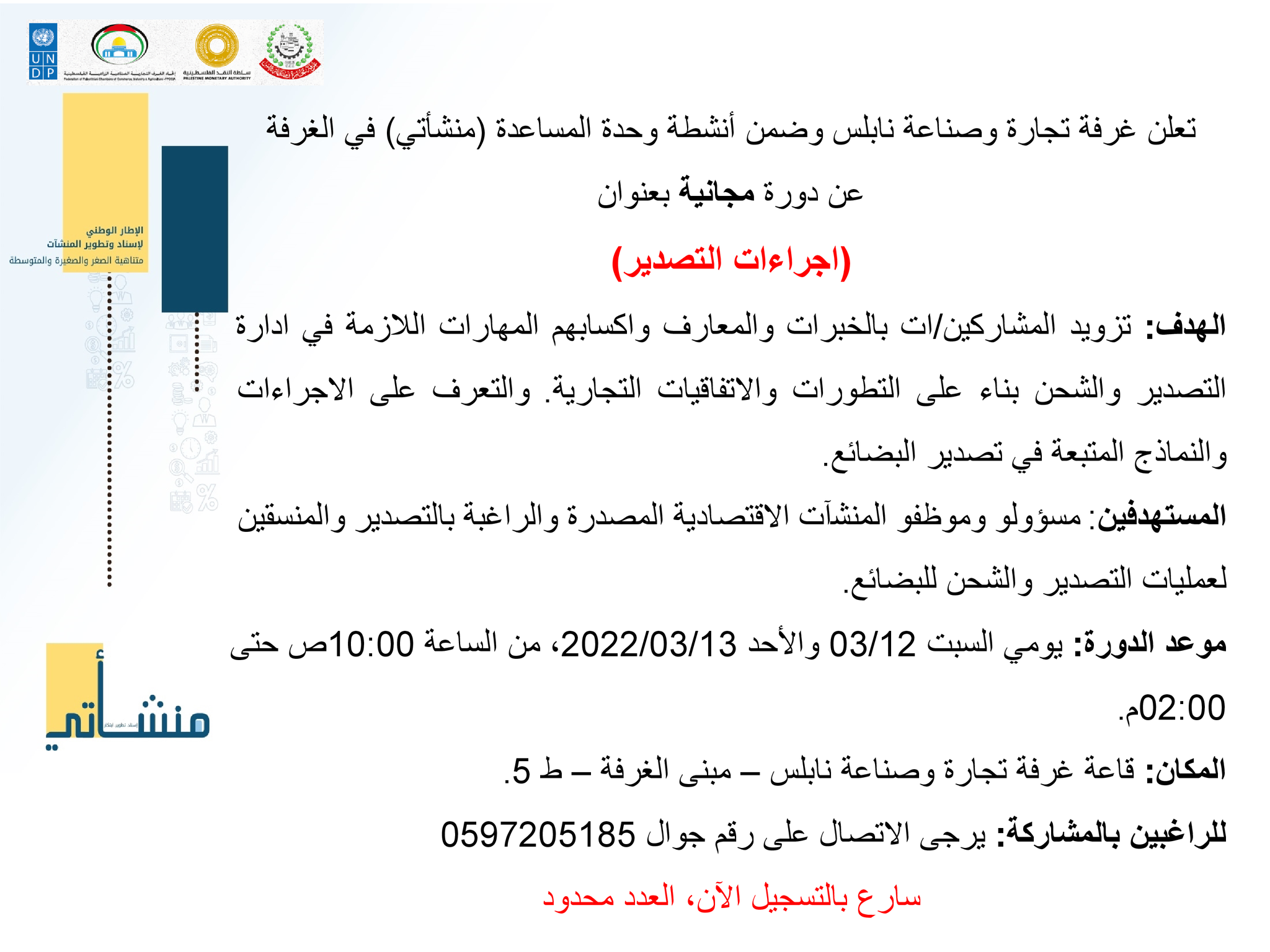 الإعلان عن دورة مجانية بعنوان "إجراءات التصدير" في غرفة تجارة نابلس.