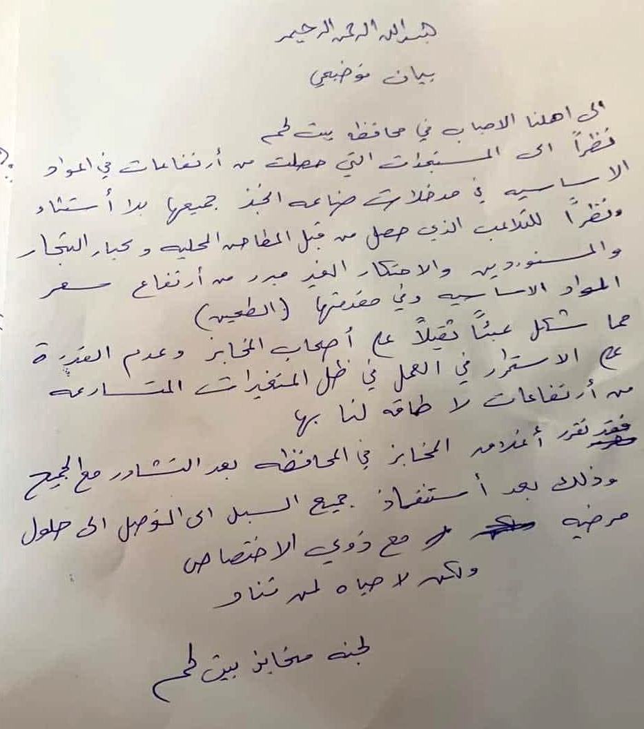 المخابز والأفران تعلن الإضراب في محافظة بيت لحم احتجاجاً على ارتفاع أسعار السلع الأساسية والمماطلة والاحتكار من قبل التجار.