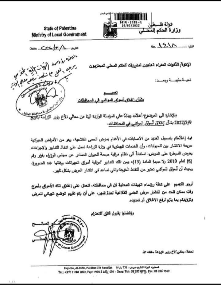 أعلنت وزارة الحكم المحلي، الخميس 10.03.2022، عن إغلاق أسواق الحلال لمدة شهر بسبب تفشي مرض الحمى القلاعية.