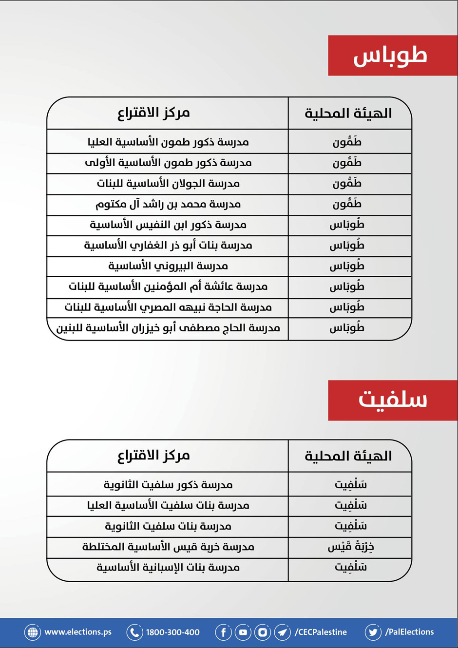 أسماء مراكز الاقتراع للانتخابات المحلية المرحلة الثانية 2021 في سلفيت وطوباس.