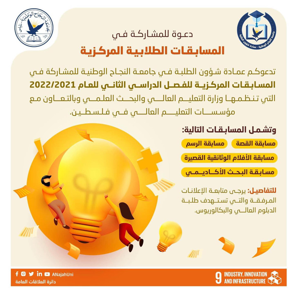 دعوة للمشاركة في المسابقات الطلابية المركزية في جامعة النجاح.