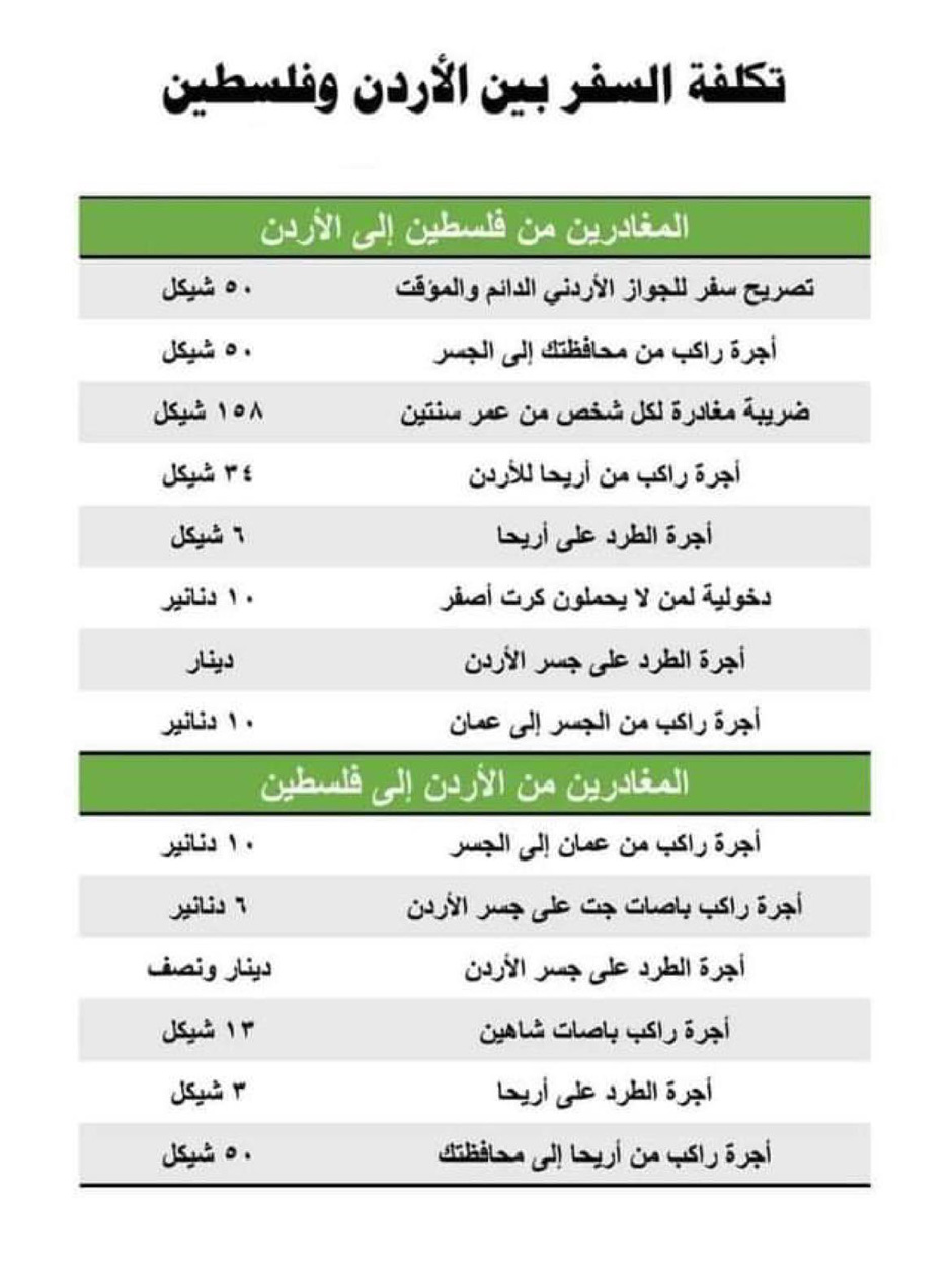 ما هي تكلفة السفر للمغادرين من فلسطين إلى الأردن والقادمين من الأردن إلى فلسطين؟